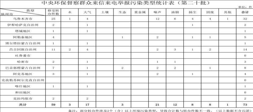 本批移交自治区的59件转办件,从区域划分上来看,乌鲁木齐市25件,占到总数的42.4%;昌吉回族自治州11件,占总数的18.6%;巴音郭楞蒙古自治州7件,占总数的11.9%。另外,阿勒泰地区4件、阿克苏地区3件,克拉玛依市、哈密市、伊犁哈萨克自治州各2件,塔城地区、博尔塔拉蒙古自治州和喀什地区均为1件。从污染类型来看,涉及噪声、大气、油烟类最多,分别占涉及环境问题总数的28.8%、23.3%、16.4%;其次是固废、扬尘、水、生态、其他类污染问题,分别占到总数的11.0%、11.0%、4.1%、4.1%、1.4%。